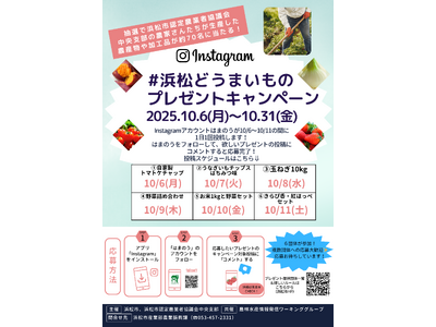「浜松市」が運営するインスタグラムアカウント"はまのう"と、当課が事務局を務める「浜松市認定農業者協議会中央支部」が共同で、浜松の農産物等が当たるプレゼントキャンペーンを実施いたします。 抽選...