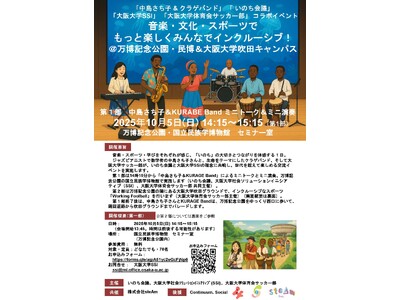10月5日(日)14:30~15:30、「中島さち子さんとKURAGE Band」を招いて、吹田の万博記念公園・民博にて、音楽・文化・スポーツでもっと楽しくみんなでインクルーシブ!を開催します。