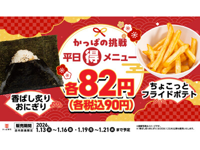皆さまの熱いリクエストにお応えして、2026年も物価高の平日ごはんの強い味方として、かっぱ寿司は挑戦を続けます!1月13日(火)~平日限定、人気の「おにぎり」「フライドポテト」を税込各90円でご提供!