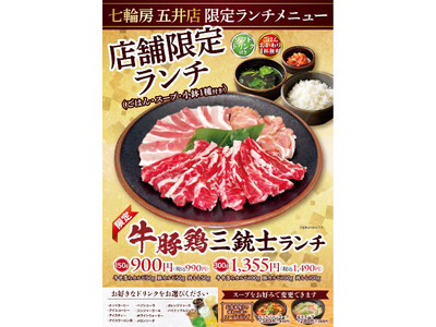 七輪房五井店限定ランチメニューの『牛豚鶏三銃士ランチ』150g:900円(税込990円)300g:1,355円(税込1,490円)にて販売開始! 株式会社安楽亭(本社:埼玉県さいたま市)が運営...