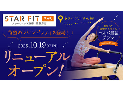 お風呂サウナに加え、女性専用マシンピラティスが楽しめる新スタイルジムへ『スターフィット365 津藤方店』が2025年10月19日(日)にリニューアルオープン。10月18日(土)から体験会も開催...
