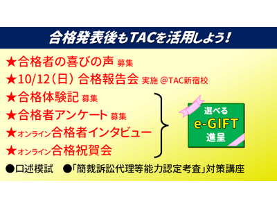 ~10月2日(木)の合格発表を受け、参加特典付きイベントを続々展開~ 司法書士試験対策講座を展開しているTAC株式会社(東京都千代田区、 代表取締役:多田敏男)は、 10/2(木)合格発表以降...