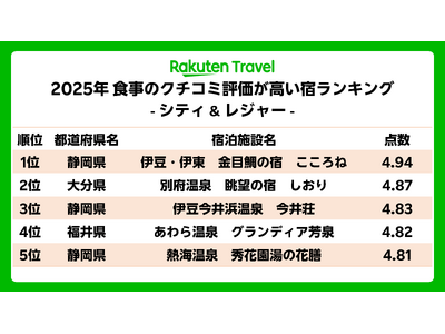 「楽天トラベル」、2025年 食事のクチコミ評価が高い宿のランキングを発表