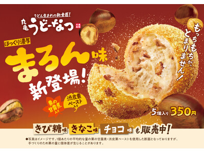 うどん生まれ※1のもっちもち食感「丸亀うどーなつ」 「栗の甘露煮」と「渋皮栗ペースト」を練り込み どこを食べても栗栗栗! 秋を満喫!ほっくり濃厚『丸亀うどーなつ まろん味』新登場