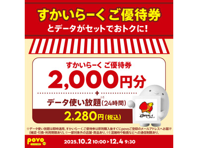 KDDI、沖縄セルラーは2025年10月2日から、povo2.0の「今だけのトッピング」として、「ガスト」、「バーミヤン」、「しゃぶ葉」など全国のすかいらーくグループ店舗で利用可能な「すかいら...