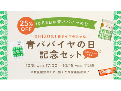 青パパイヤ酵素に新サイズ登場!10月8日の「青パパイヤの日」に合わせて待望の60包入りが新発売。さらに数量限定でお得なセットもご用意しました。