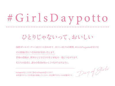 10/11(国際ガールズデー)から、日本、そして世界の女の子の"明日"に支援が届く参加型企画を開催。『食べる』『撮る』『#GirlsDaypottoをつけて投稿』 小さな一歩を、いっしょに。 ...