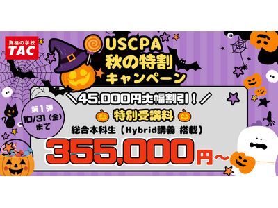 TAC株式会社(東京都千代田区、代表取締役:多田敏男)は、USCPA試験対策講座で受講料がお得になる「秋の特割キャンペーン第1弾」を10月1日(水)からスタート!秋からUSCPA合格を目指す方...
