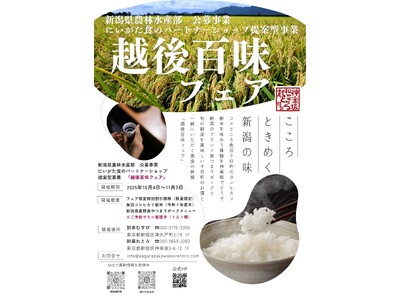 期間限定で『越後百味フェア』の特別メニューをお得な価格にてご用意いたしました。新潟の食と文化に触れる美味しい食のひとときをお楽しみいただけます。 「越後百味フェア」は、新潟の誇る米や酒、野菜、...