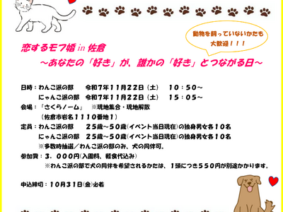 【千葉県佐倉市】第45回 令和7年度第2弾は、初開催!動物好きのための婚活!佐倉市の婚活イベント「恋するモフ婚 in 佐倉~あなたの「好き」が、誰かの「好き」とつながる日~」が開催決定!