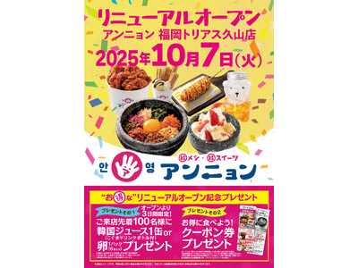 1999年から愛され続けた石焼ビビンバ専門店「アンニョン」が、韓メシ韓スイーツ「アンニョン」として、10月7日(火)に福岡トリアス久山店でリニューアルオープン!今回のリニューアルオープンでは記...