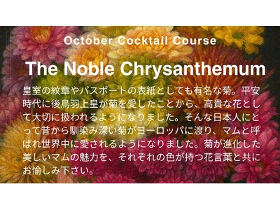 株式会社クローバークラブが運営する、「EBISU FLOWER PARK」は、2025年10月限定のシーズナルカクテルコース「The Noble Chrysanthemum」を発表いたしました...