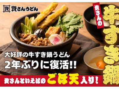 【資さんうどんの牛すき鍋復活!】12/11(木)~2年ぶりの復活!!「牛すき鍋うどん」が期間限定で登場!「資さんうどん」の代名詞「ごぼ天」が入りパワーアップした「牛すき鍋」を心ゆくまでご堪能下さい!