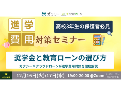 まだ間に合う"進学費用対策" 奨学金教育ローンをまとめて学べる12月16日(火)17日(水) ガクシー会員45万人突破記念 日本最大級の奨学金プラットフォームを運営する株式会社ガクシー(本社:...