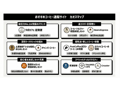 コーヒー豆研究所にて「おすすめコーヒー通販サイト カオスマップ」を公開"自分に合う一杯"が見つかる11サービスを6つの目的別に整理