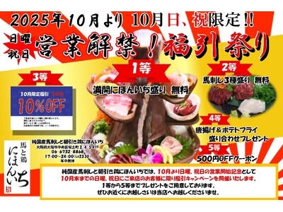 『純国産馬刺しと朝引き鶏 にほんいち』10月より定休日なしで営業開始!