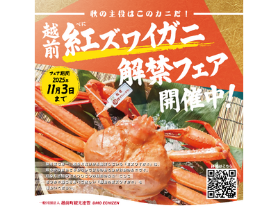 ~秋の味覚、鮮度抜群の紅ズワイガニを堪能~ キャンペーン画像 福井県越前町では、この秋の味覚を代表する「紅ズワイガニ」の漁解禁に合わせ、「紅ズワイガニ解禁フェア2025」を開催します。越前町は...