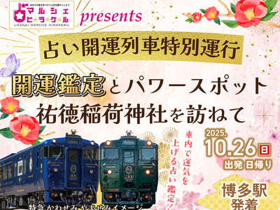 九州旅客鉄道株式会社(以下、JR九州)では、「特急 かわせみ やませみ」の車内で開運鑑定を受けることができる「占い開運列車」を博多駅~肥前浜駅間で特別運行します! この機会にぜひ、ご参加くださ...