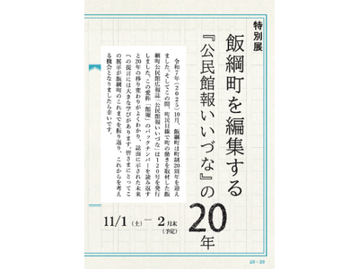 町制20周年を記念して、飯綱町公民館報編集委員とタイアップした特別展を開催します。「公民館報いいづな」の20年の歩みをテーマごとに紹介。飯綱町公民館報と、それらを日々編集し続ける編集委員たちの...