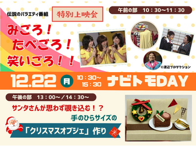 【12/22 開催】<ナビトモDAY!>伝説のバラエティ番組「みごろ!たべごろ!笑いごろ!!」特別上映会&サンタさんが思わず覗き込む!?手のひらサイズの「クリスマスオブジェ」作り