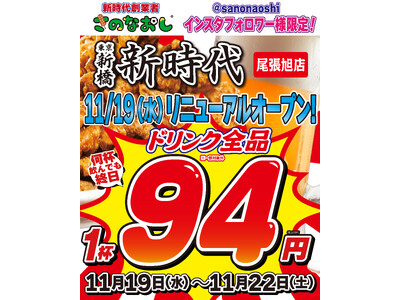 【リニューアルオープン】全国200店舗、東京で行列のできる居酒屋『新時代』2025年11月19日(水)『新時代 尾張旭店』RENEW ALOPEN