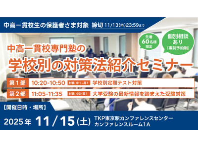 【累計参加者100名超!】中高一貫校生に向けた「学校別の対策法紹介セミナー」を11月15日(土)に東京で開催。「定期テスト対策」と「受験戦略」を徹底解説!