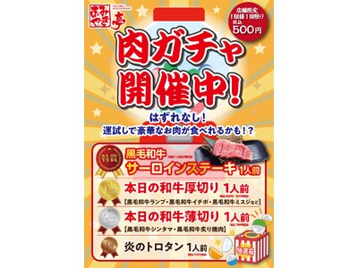 【あみやき亭】1回500円で"絶対にお得"!最高1,400円超のサーロインステーキが当たる「肉ガチャ」を2月9日より平日限定で開催~ ハズレなし!赤字覚悟の運試し企画 ~