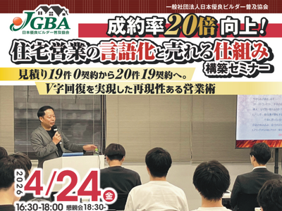 ~見積り19件0契約から20件19契約へ。V字回復を実現した再現性ある営業術~ 一般社団法人日本優良ビルダー普及協会(事務局:東京都港区、代表理事:田島亮、以下「JGBA」)は工務店リフォーム...