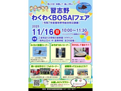 令和7年度習志野市総合防災訓練)を避難所となる市内26会場にて開催 今年は総合防災訓練が大幅にリニューアル! 「見に行き、体験して、楽しむ学ぶ防災」をテーマに、こどもから大人まで誰でも楽しめる...