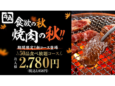【牛角】食欲の秋に新登場!50品食べ放題が2,780円(税込3,058円)!タン・カルビ・ハラミ・ホルモンまで!気軽に楽しめる充実コース