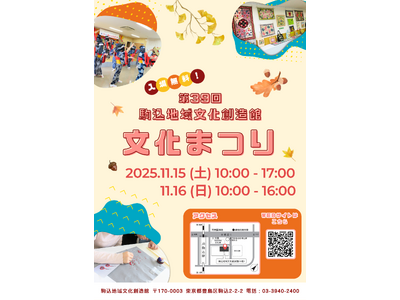 公益財団法人としま未来文化財団(所在地:東京都豊島区、理事長:合場直人)は、駒込地域文化創造館(豊島区駒込222)にて、館最大の文化イベント「第39回 駒込地域文化創造館文化まつり」を、11月...