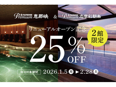 新年の旅行がお得に!2026年1月5日スタートリニューアルオープン記念25%OFFキャンペーン【Premium 恵那峡・Premium 志摩彩朝楽】