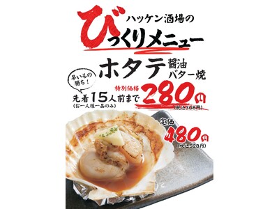 【ハッケン酒場】先着15食限定!醤油バター香る「ホタテ」が280円の衝撃価格、4月15日より"びっくりメニュー"登場