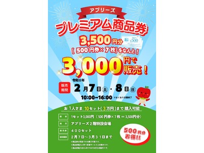弘前駅ビル アプリーズでは、3,000円で3,500円分のお買い物ができる、お得な『プレミアム商品券』を数量限定販売します! 弘前駅ビル アプリーズでは、2026年2月7日(土)8日(日)の2...