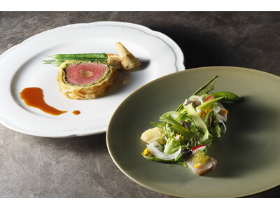 オークラフレンチの伝統を継承し、時代に合わせて進化する料理をご用意 手前より:前菜、肉料理(「オークラフレンチの夕べ」 ~シェフ達が紡ぐ美食のストーリー~第1回より) ホテルオークラ神戸(所在...