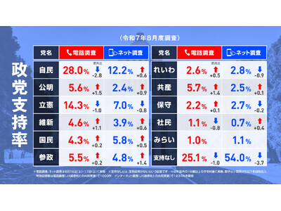 参院選後も国民民主党や参政党などの勢い止まらず!2025年8月実施 電話&ネットのハイブリッド意識調査結果を発表【選挙ドットコム×JX通信社】