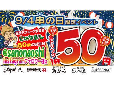 全国に200店舗を展開する飲食チェーン新時代グループは、2025年9月4日(木)「串の日」に、全店にてドリンクを何杯でも何時でも1杯 50円(税込55円)でご提供する特別イベントを開催いたしま...