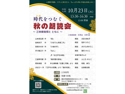 2025年10月23日(木)に開催される『時代(とき)をつむぐ秋の朗読会~三味線端唄とともに~』の申込受付を8月1日(金)9時より開始します!100名定員ですのでお早めにお申し込みください。 ...