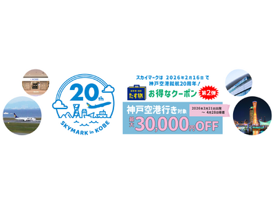 2026年2月21日出発~2026年4月28日帰着分のスカイマーク航空券とホテルがセットになった各地発神戸行の神戸空港就航20周年記念クーポンキャンペーン第二弾の販売を開始しました! たす旅 ...
