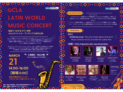 グラミー賞ノミネート奏者らが出演(一般公開入場無料) 明治大学商学部および所康弘ゼミナールは、2026年3月21日(土)、米国カリフォルニア大学ロサンゼルス校(UCLA)の音楽家グループを招き...
