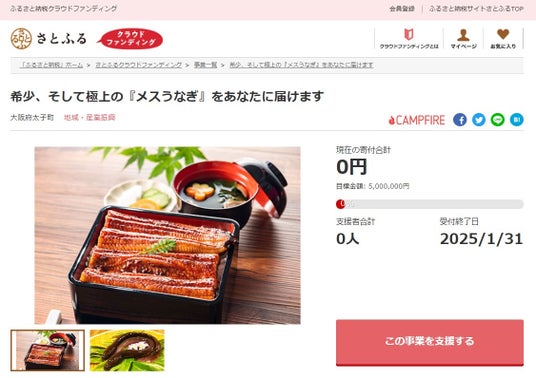 大阪府太子町とふるさと納税ポータルサイト「さとふる」を運営する株式会社さとふる(本社:東京都中央区、代表取締役社長 兼 CEO:藤井 宏明)は、「さとふるクラウドファンディング」にて、「希少、そして極上の『メスうなぎ』をあなたに届けます」の寄付受け付けを2024年10月25日より開始します。