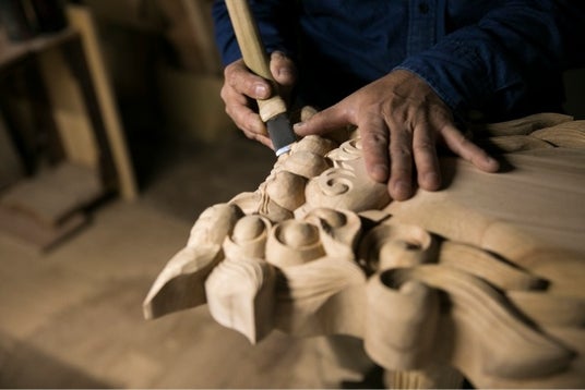突板張りに手彫りの彫刻、繊細な組子に厚みのある一枚板。
