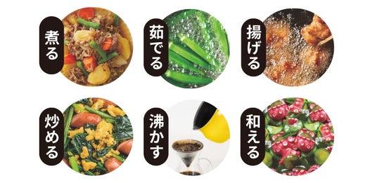 煮る・茹でる・揚げる・炒める・沸かす・和えるの6つ調理に対応しています。