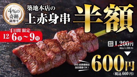 12月6日(金)~12月9日(月)4日間限定で、最高級A5ランク和牛"薩摩牛4%の奇跡"を使用した「築地本店の上赤身串」通常価格1本1,200円(税込1,320円)を600円(税込660円)でご提供!