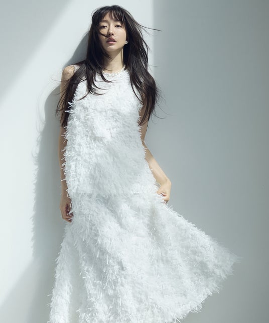 やさしい春風に揺れるフェザーカットジャガード、モダンなコクーンシルエット。