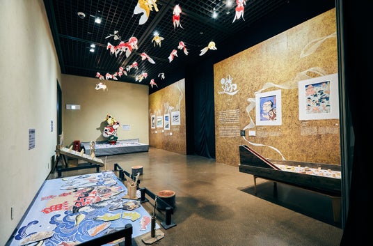 浮世絵展第八幕のテーマは「豪」。歌川国芳の水滸伝シリーズをはじめとする、武者絵や相撲を題材にした豪快な中にも繊細さがあり、荒々しいエネルギーを放出する浮世絵をダイナミックに魅せる空間。