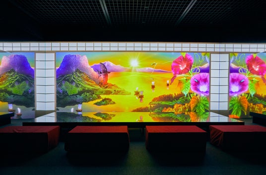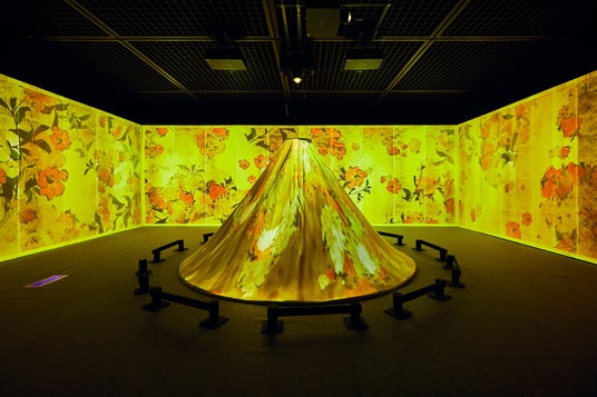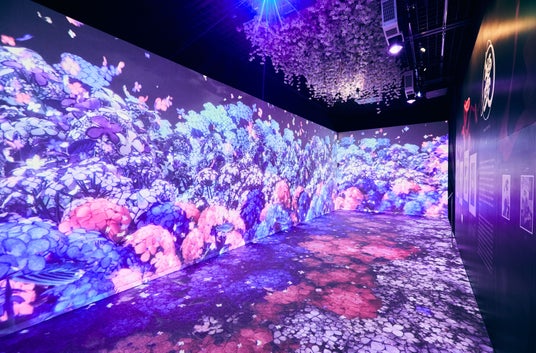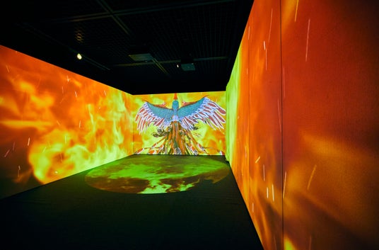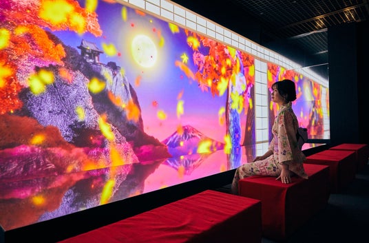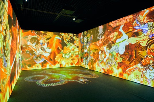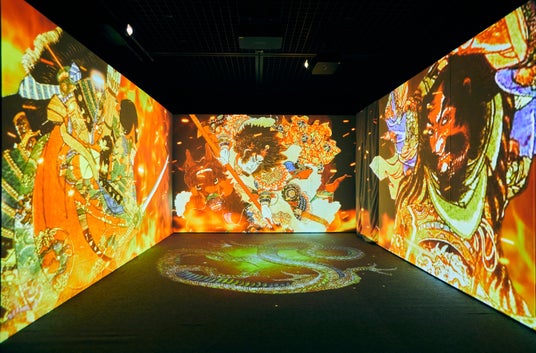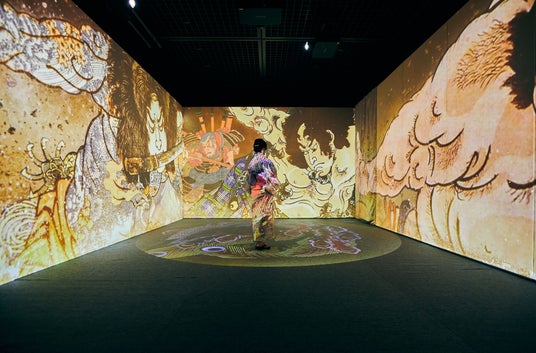 立体映像空間で鮮やかな浮世絵の世界に没入できる体感型デジタルアートミュージアム。歌川国芳の水滸伝シリーズの武者絵や相撲など躍動感、臨場感、エネルギーが凝縮された浮世絵の常識を打ち破る浮世絵の数々。