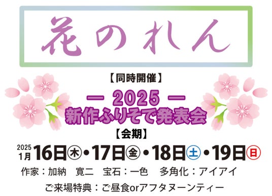 企画内容:加納寛二の作品展示販売・ジュエリー一色による宝飾品展示販売・特選五番街・敷布団アイアイ販売・2025年新作振袖発表会