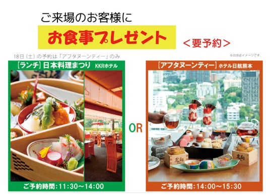 ご来場予約をいただいたお客様には、ご昼食(KKRホテル)もしくはアフタヌーンティー(ホテル日航熊本)にご招待。熊本城と四季を感じる贅沢なひとときをお楽しみください。