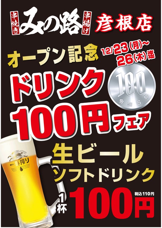 オープン記念で12月23日(月)~26日(木)までは『生ビール(中ジョッキ)110円』と『ソフトドリンク110円』イベント開催致します。